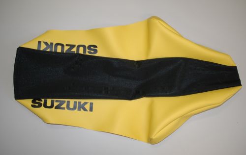 Suzuki DR 650 2005 seat cover in black/yellow UV resistant vinyl with Suzuki in black on each side