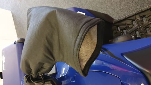 Thermal mitts mounted on handle bars by draw cord. 99% wool lining and Waterproof Oil Skin outer with a wire sewn in to the opening to make getting your hands in and out safe and easy.
