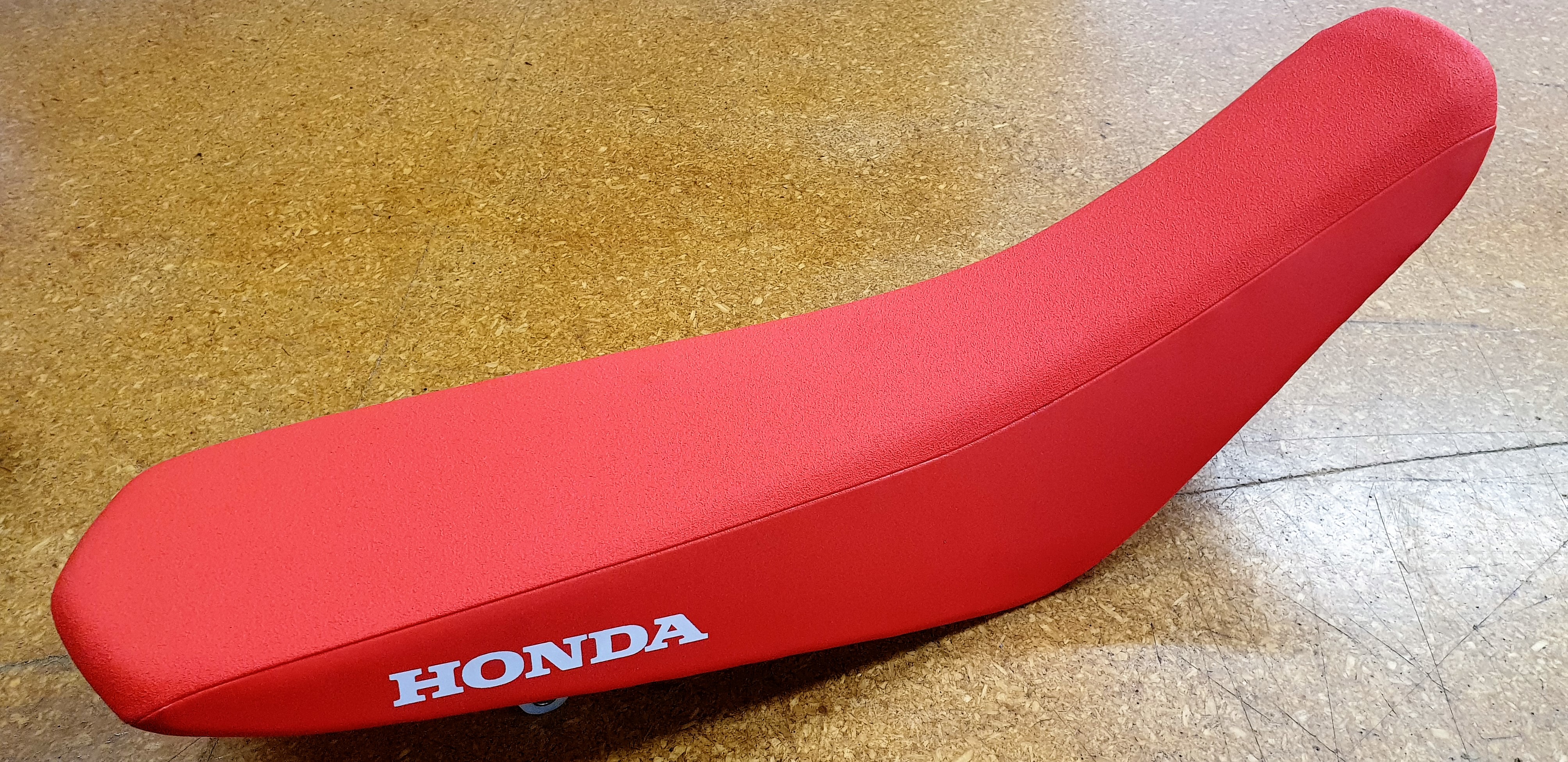 Honda CRF 250F 2019- seat cover in red uv resistant vinyl, grippa top and Honda in white printed on each side.
