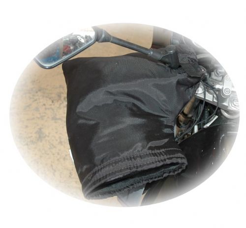 Thermal Mitts mounted on handlebars by draw cord with a cut out and velcro closure for mirrors on road legal bikes or farm bikes