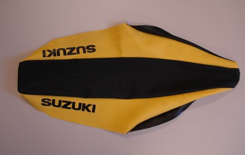 Suzuki RM 125 2005 seat cover in black/yellow UV resistant vinyl with Suzuki on each side